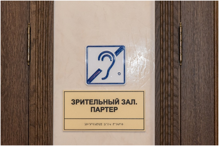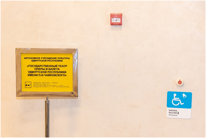 ✔ Главный вход в театр оборудован табличкой с указанием названия театра шрифтом Брайля и системой для вызова помощи персонала.
