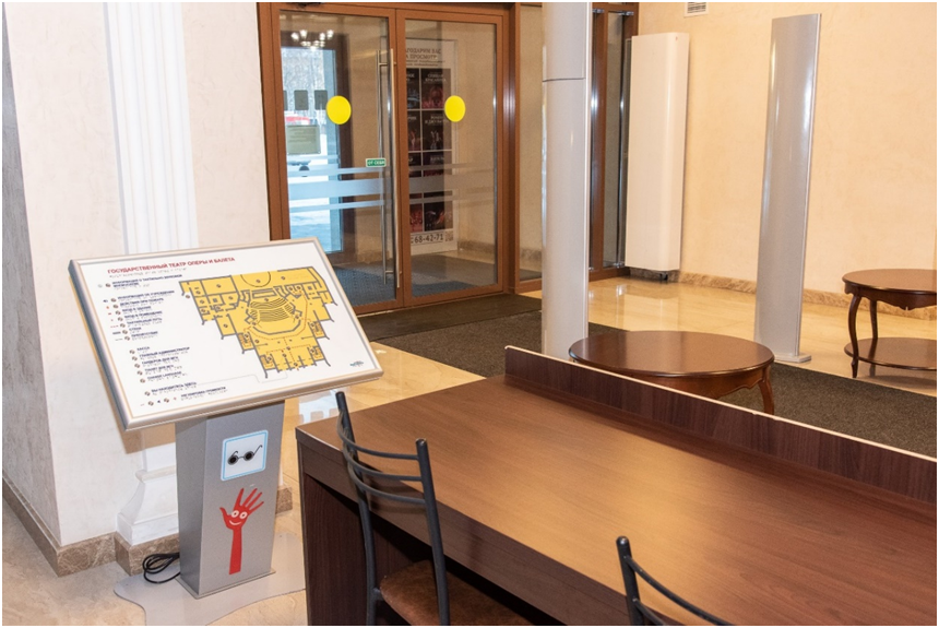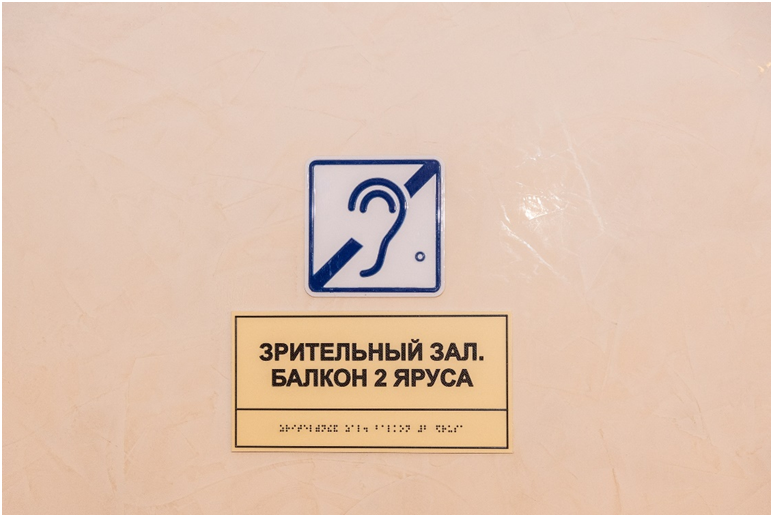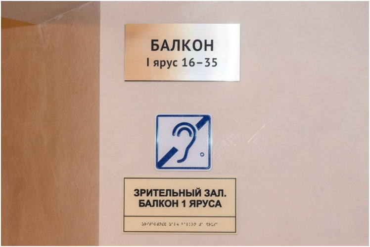 ✔ Главный вход в театр оборудован табличкой с указанием названия театра. Внутри театра есть визуальные схемы каждого этажа и информационные стенды.