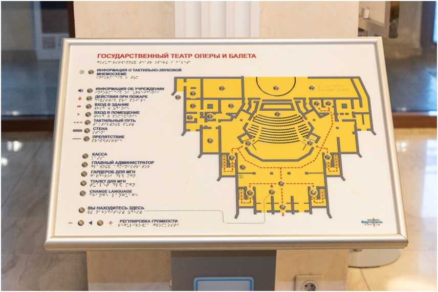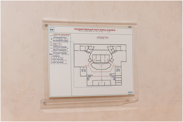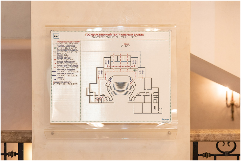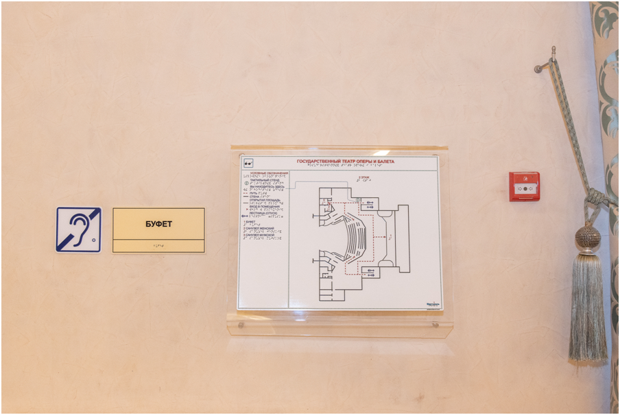 ✔ На входе в зрительскую часть театра имеется тактильная мнемосхема с индукционным контуром, говорящая на русском и английском языках.